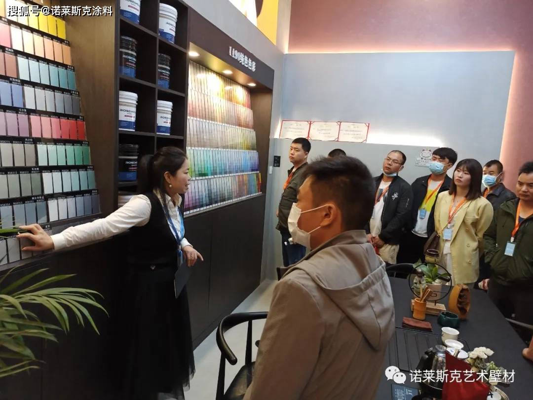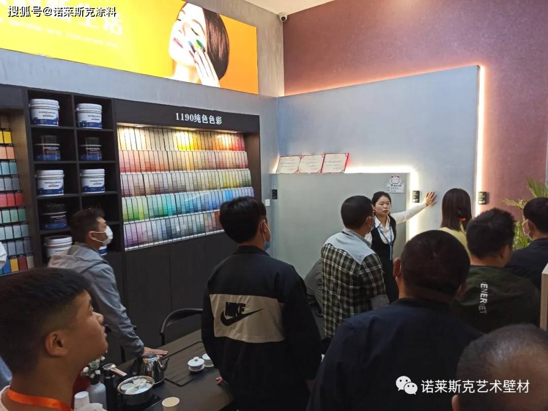 前来参与培训的学员们,对诺莱斯克美学馆有着浓厚的兴趣,大家争先恐后的参观着展厅的每一处艺术角。色卡墙、工具墙,样板展示区旁围满了前来培训的学员,大家在欣赏中感叹着艺术涂料之魅力,工艺之精美。