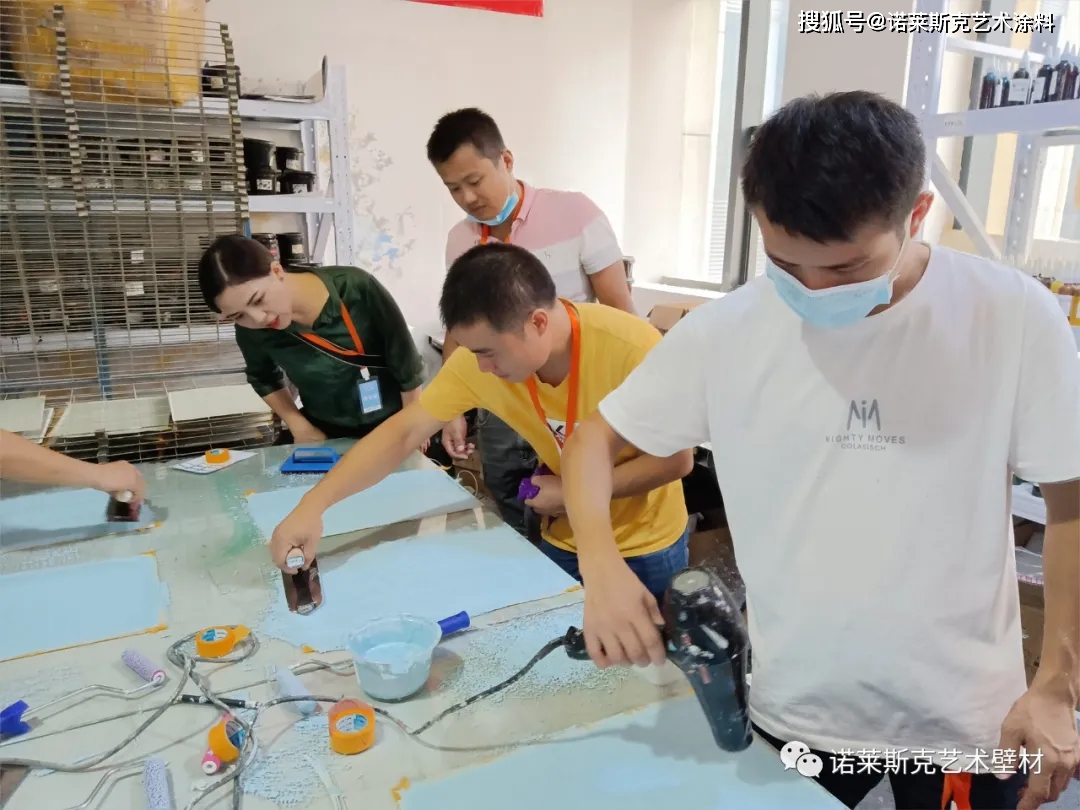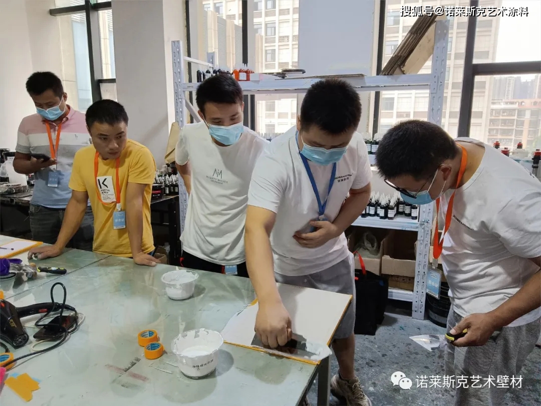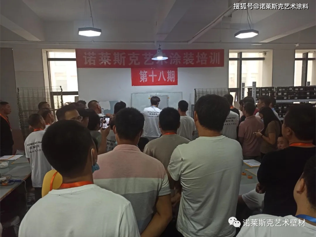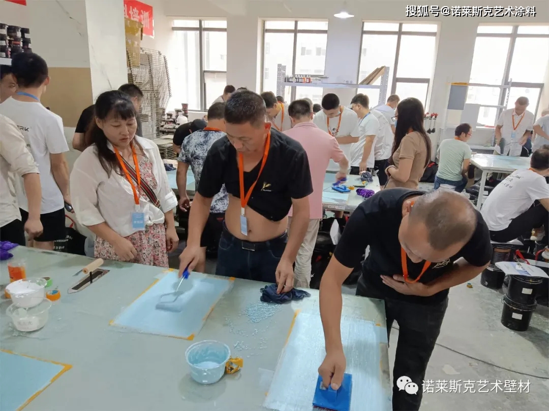 本次艺术涂料培训,重点对墙艺师的工艺进行强化培训,主要采取现场教学+现场实操的方式,由诺莱斯克三大名师现场将工艺的施工步骤、技巧、注意事项通过演练跟大家进行详细的讲解。