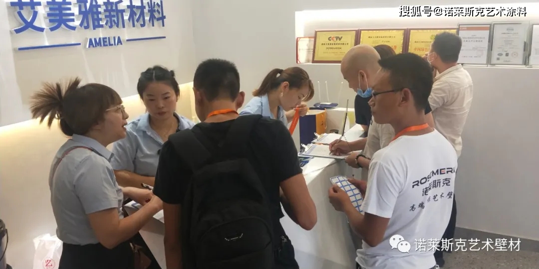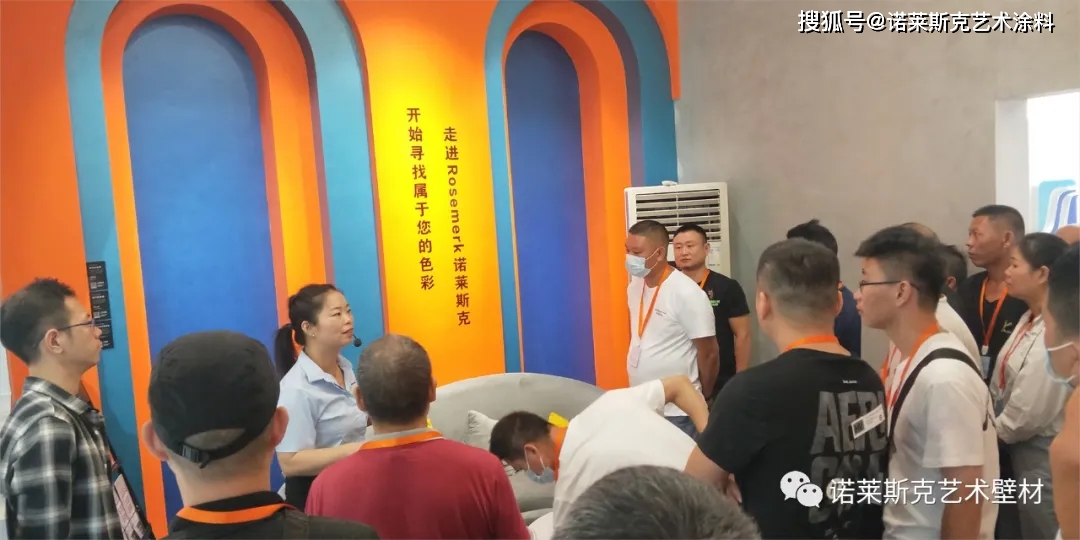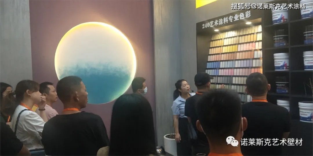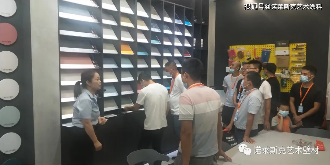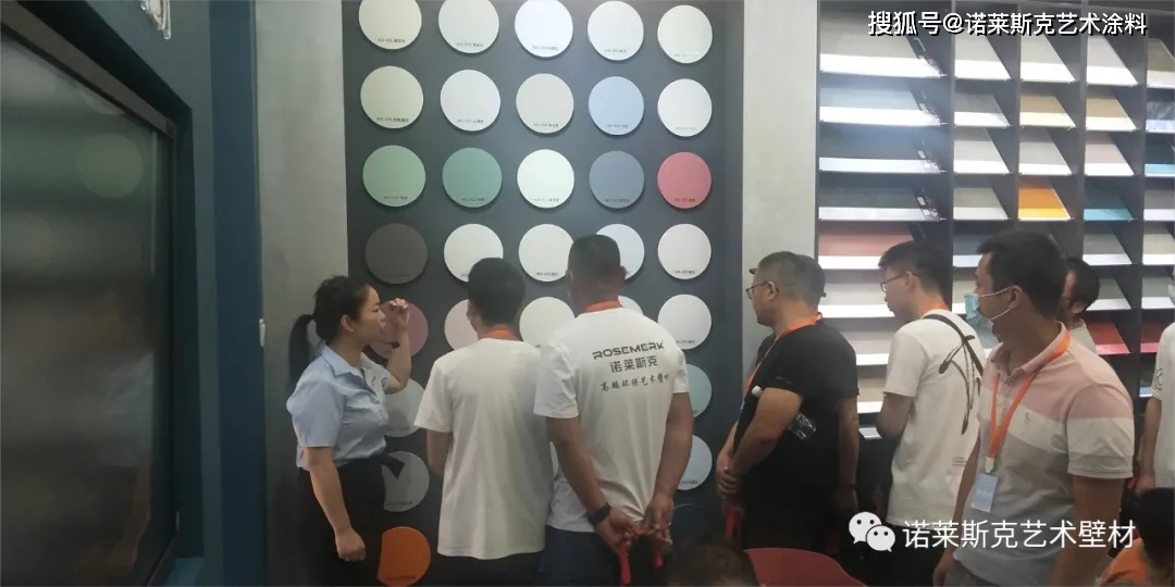 前来参与培训的学员们,对诺莱斯克美学馆有着浓厚的兴趣,大家争先恐后的参观展厅的每一处艺术角。色卡墙、工具墙,样板区旁围满了前来培训的学员,大家在欣赏中,感叹着艺术涂料之魅力,工艺之精美。